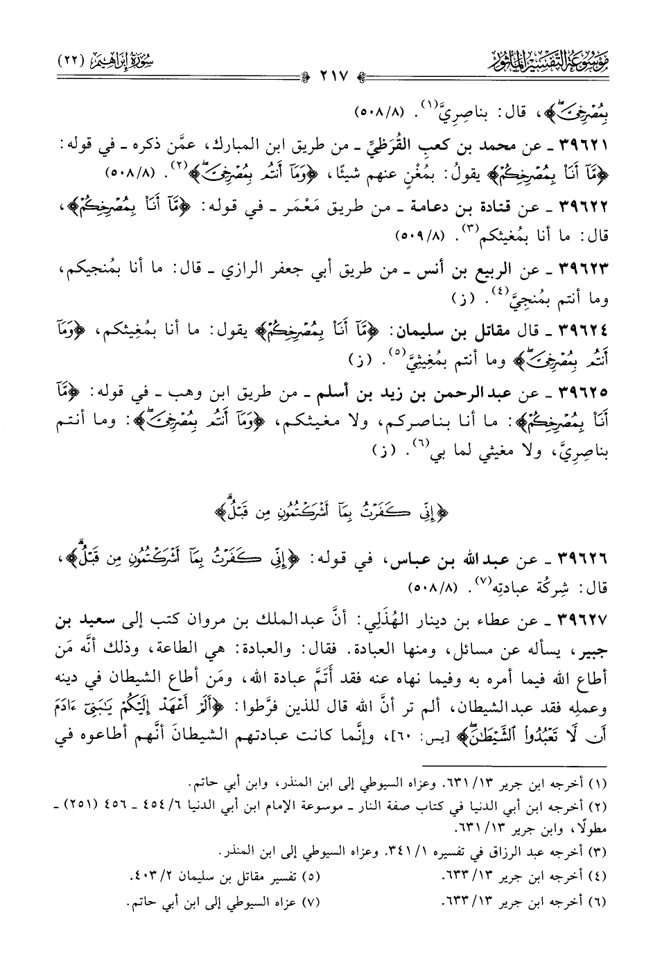 ٣٩٦٢١ - عن محمد بن كعبِ القُرَظِيِّ -من طريق ابن المبارك، عمَّن ذكره- في قوله: {ما أنا بمصرخكم} يقولُ: بمُغْنٍ عنهم شيئًا، {وما أنتُم بمصرخيَّ} (¬٢). (٨/ ٥٠٥)