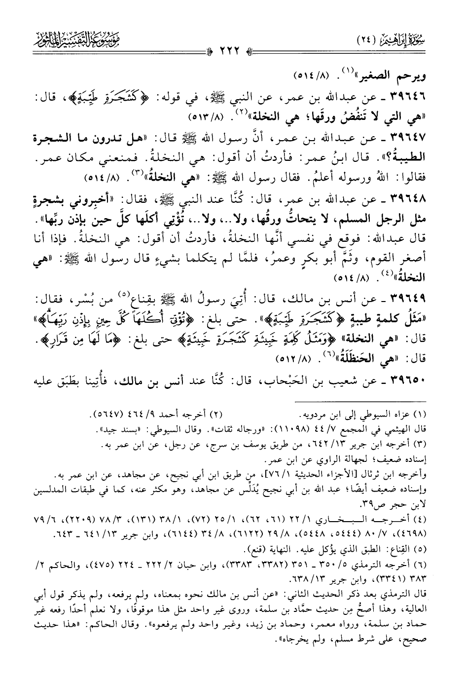 ٣٩٦٤٦ - عن عبد الله بن عمر، عن النبي - صلى الله عليه وسلم -، في قوله: {كشجرةٍ طيبةٍ}، قال: «هي التي لا تَنفُضُ ورقَها؛ هي النخلة» (¬٢). (٨/ ٥١٣)