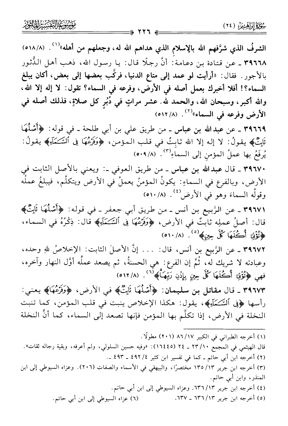 ٣٩٦٧١ - عن الرَّبيع بن أنس -من طريق أبي جعفر- في قوله: {أصلُها ثابتٌ} قال: أصلُ عملِه ثابتٌ في الأرض، {وفرعُها في السَّماء} قال: ذِكْرُهُ في السماء، {تُؤتِي أكُلها كلَّ حين} (¬٥). (٨/ ٥١٠)