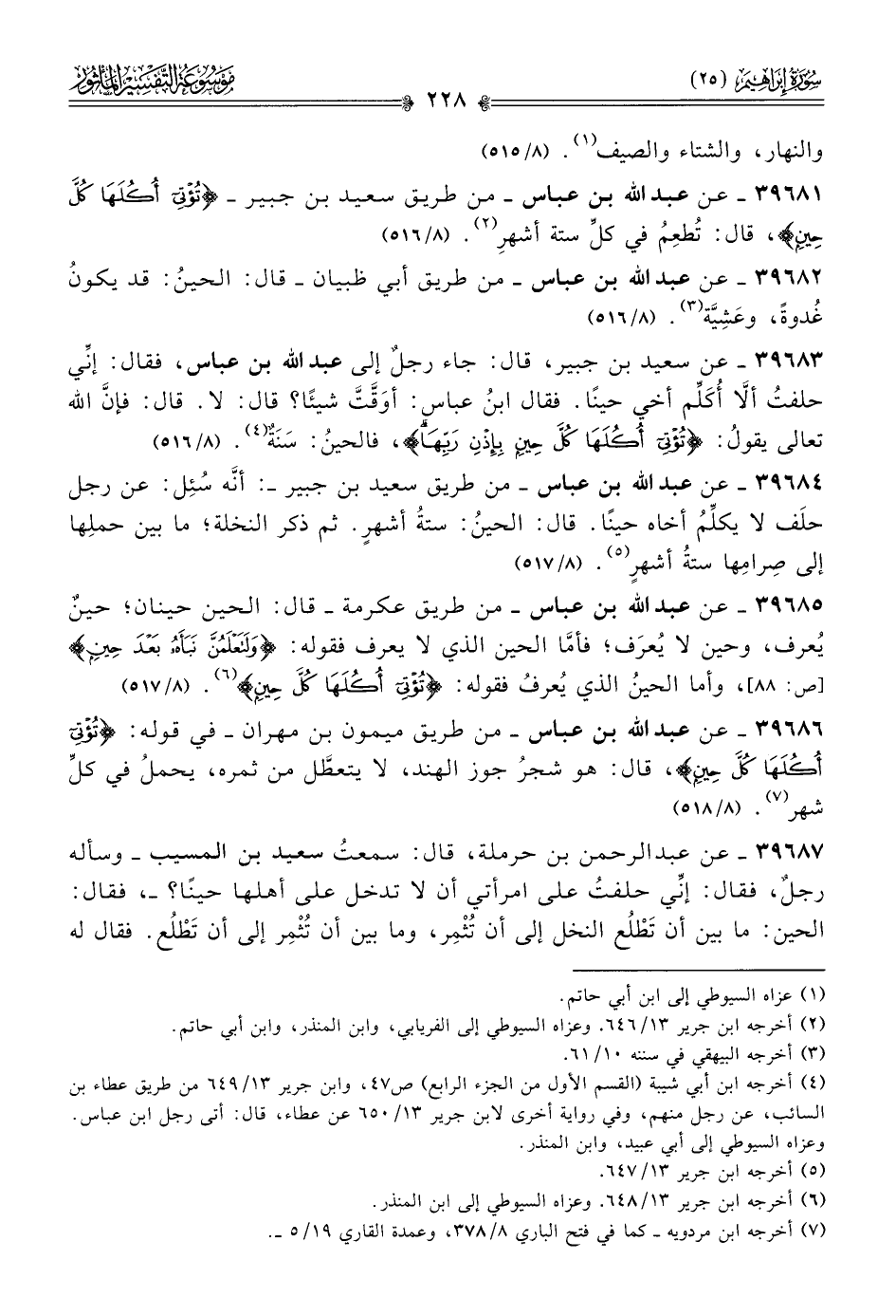 ٣٩٦٨٥ - عن عبد الله بن عباس -من طريق عكرمة- قال: الحين حينان؛ حينٌ يُعرف، وحين لا يُعرَف؛ فأمّا الحين الذي لا يعرف فقوله: {ولتعلمنَّ نبأه بعد حين} [ص: ٨٨]، وأما الحينُ الذي يُعرفُ فقوله: {تُؤتي أكُلها كلَّ حين} (¬٦). (٨/ ٥١٧)