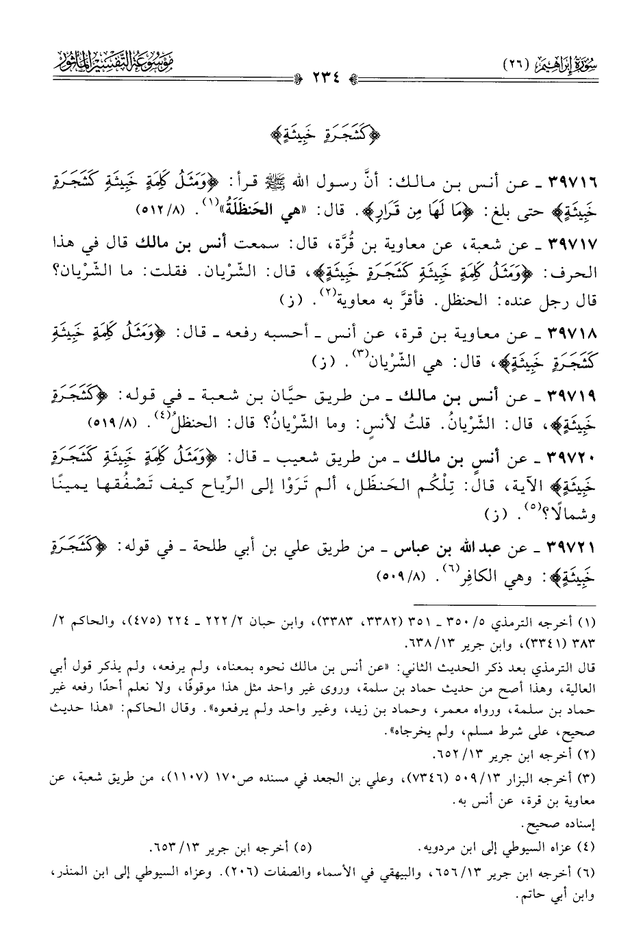 ٣٩٧٢٠ - عن أنسٍ بن مالك -من طريق شعيب- قال: {ومثل كلمة خبيثة كشجرة خبيثة} الآية، قال: تِلْكُم الحَنظَل، ألم تَرَوْا إلى الرِّياح كيف تَصْفُقها يمينًا وشمالًا؟ (¬٥). (ز)