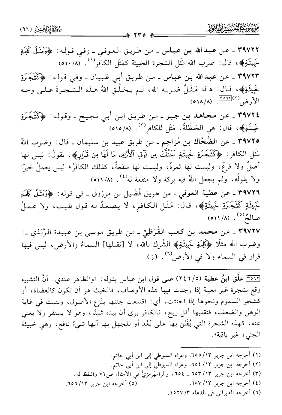[٣٥٦٢] علَّق ابنُ عطية (٥/ ٢٤٦) على قول ابن عباس بقوله: «والظاهر عندي: أنّ التشبيه وقع بشجرة غير معينة إذا وجدت فيها هذه الأوصاف، فالخبث هو أن تكون كالعضاة، أو كشجر السموم ونحوها إذا اجتثت، أي: اقتلعت جثتها بنَزع الأصول، وبقيت في غاية الوهن والضعف، فتقلبها أقل ريح، فالكافر يرى أن بيده شيئًا، وهو لا يستقر ولا يغني عنه، كهذه الشجرة التي يُظَن بها على بُعْد أو للجهل بها أنها شيءٌ نافع، وهي خبيثة الجني، غير باقية».