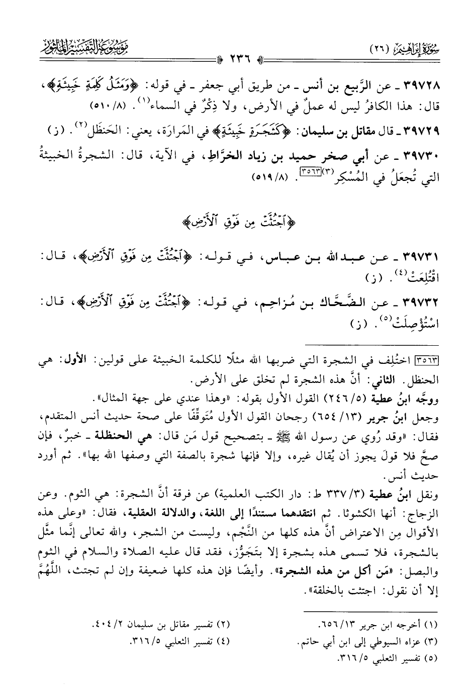 ٣٩٧٢٩ - قال مقاتل بن سليمان: {كشجرة خبيثة} في المَرارَة، يعني: الحَنظَل (¬٢). (ز)