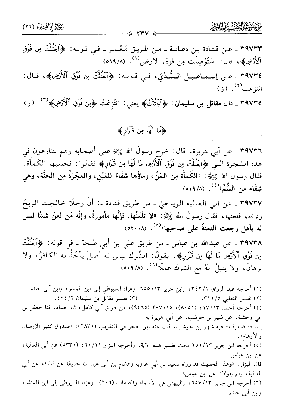 ٣٩٧٣٥ - قال مقاتل بن سليمان: {اجتثت} يعني: انتُزِعَتْ {من فوق الأرض} (¬٣). (ز)