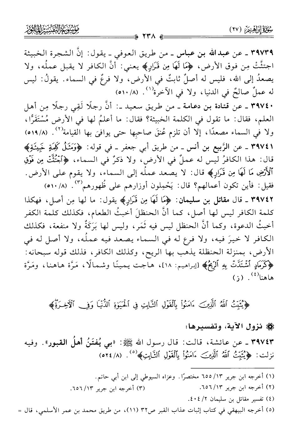 ٣٩٧٤٣ - عن عائشة، قالت: قال رسول الله - صلى الله عليه وسلم -: «بي يُفتَنُ أهلُ القبور». وفيه نزلت: {يُثبتُ الله الَّذين ءامنوا بالقولِ الثّابت} (¬٥). (٨/ ٥٢٤)