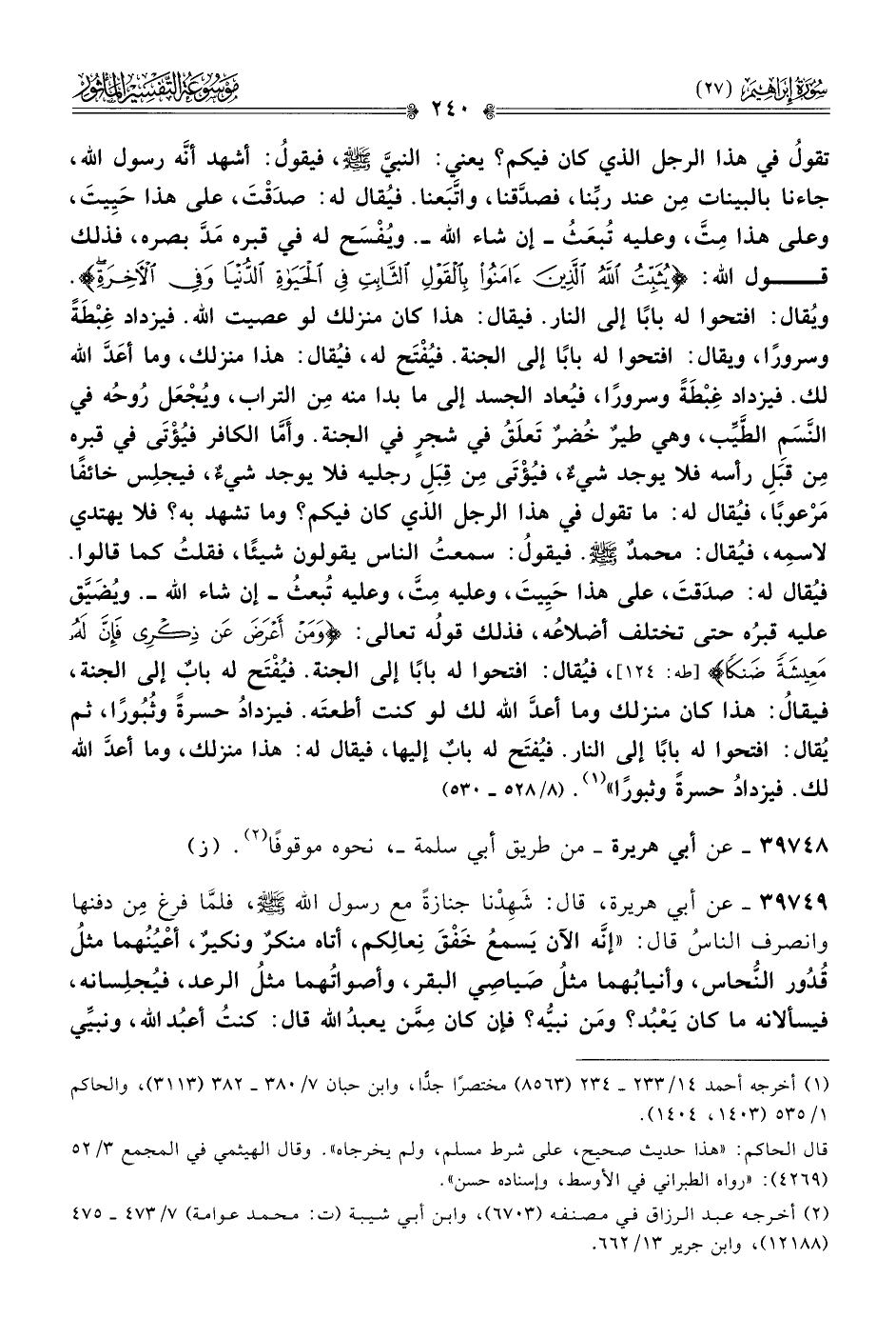 ما تقولُ في هذا الرجل الذي كان فيكم؟ يعني: النبيَّ - صلى الله عليه وسلم -، فيقولُ: أشهد أنّه رسول الله، جاءنا بالبينات مِن عند ربِّنا، فصدَّقنا، واتَّبَعنا. فيُقال له: صدَقْتَ، على هذا حَيِيتَ، وعلى هذا مِتَّ، وعليه تُبعَثُ -إن شاء الله-. ويُفْسَح له في قبره مَدَّ بصره، فذلك قول الله: {يُثبتُ الله الَّذين ءامنوا بالقول الثابت في الحياة الدنيا وفي الآخرة}. ويُقال: افتحوا له بابًا إلى النار. فيقال: هذا كان منزلك لو عصيت الله. فيزداد غِبْطَةً وسرورًا، ويفال: افتحوا له بابًا إلى الجنة. فيُفْتَح له، فيُقال: هذا منزلك، وما أعَدَّ الله لك. فيزداد غِبْطَةً وسرورًا، فيُعاد الجسد إلى ما بدا منه مِن التراب، ويُجْعَل رُوحُه في النَّسَمِ الطَّيِّب، وهي طيرٌ خُضرٌ تَعلَقُ في شجرٍ في الجنة. وأَمّا الكافر فيُؤْتى في قبره مِن قبَلِ رأسه فلا يوجد شيءٌ، فيُؤْتى مِن قِبَلِ رجليه فلا يوجد شيءٌ، فيجلِس خائفًا مَرْعوبًا، فيُقال له: ما تقول في هذا الرجل الذي كان فيكم؟ وما تشهد به؟ فلا يهتدي لاسمِه، فيُقال: محمدٌ - صلى الله عليه وسلم -. فيقولُ: سمعتُ الناس يقولون شيئًا، فقلتُ كما قالوا. فيُقال له: صدَقتَ، على هذا حَيِيتَ، وعليه مِتَّ، وعليه تُبعثُ -إن شاء الله-. ويُضَيَّق عليه قبرُه حتى تختلف أضلاعُه، فذلك قولُه تعالى: {ومنْ أعرَضَ عن ذكري فإنّ لهُ معيشةً ضنكًا} [طه: ١٢٤]، فيُقال: افتحوا له بابًا إلى الجنة. فيُفْتَح له بابٌ إلى الجنة، فيقالُ: هذا كان منزلك وما أعدَّ الله لك لو كنت أطعتَه. فيزدادُ حسرةً وثُبُورًا، ثم يُقال: افتحوا له بابًا إلى النار. فيُفتَح له بابٌ إليها، فيقال له: هذا منزلك، وما أعدَّ الله لك. فيزدادُ حسرةً وثبورًا» (¬١). (٨/ ٥٢٨ - ٥٣٠)