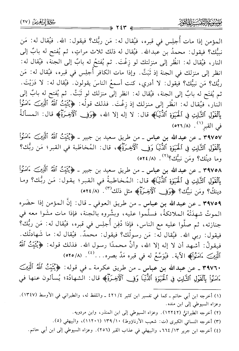 ٣٩٧٥٧ - عن عبد الله بن عباس -من طريق سعيد بن جبير- {يثبتُ اللهُ الَّذين ءامنوا بالقول الثابت في الحياة الدنيا وفي الآخرة}، قال: المُخاطَبة في القبر؛ مَن ربُّك؟ وما دينُك؟ ومَن نبيُّك؟ (¬٢). (٨/ ٥٢٤)
