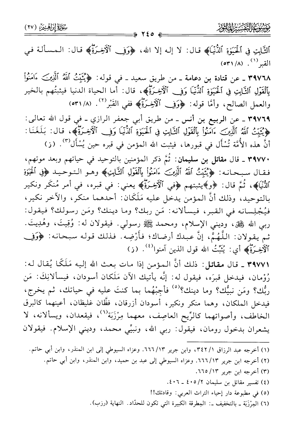 ٣٩٧٦٩ - عن الربيع بن أنس -من طريق أبي جعفر الرازي- في قول الله تعالى: {يثبت الله الذين ءامنوا بالقول الثابت في الحياة الدنيا وفي الآخرة}، قال: بَلَغَنا: أنّ هذه الأُمَّة تُسْأَل في قبورها، فيثبت الله المؤمن في قبره حين يُسْأَل (¬٣). (ز)