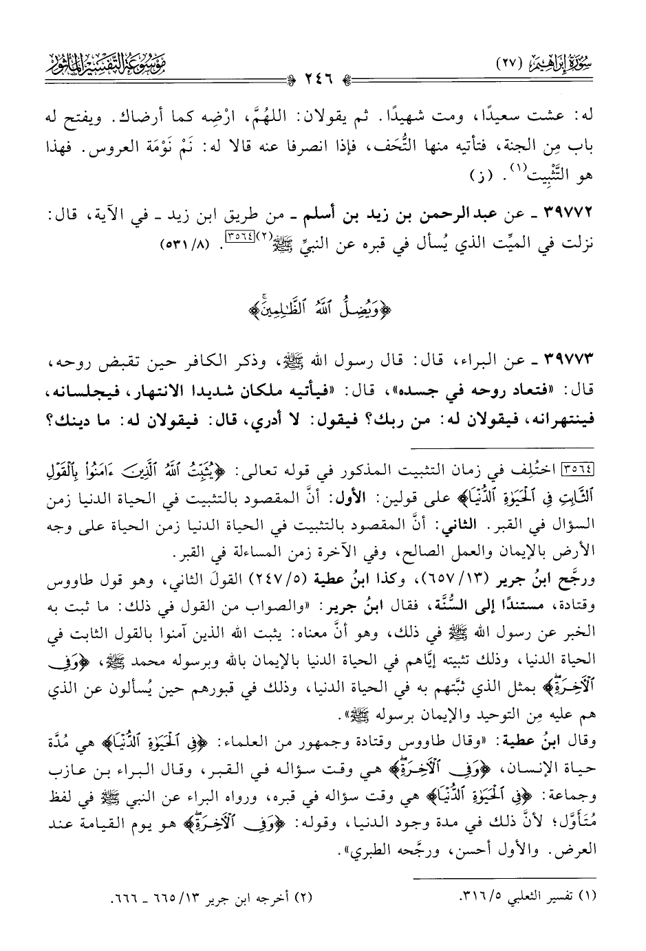 [٣٥٦٤] اختُلِف في زمان التثبيت المذكور في قوله تعالى: {يُثَبِّتُ اللهُ الذِينَ ءامَنُوا فِي الحَياةِ الدُّنْيا} على قولين: الأول: أنّ المقصود بالتثبيت في الحياة الدنيا زمن السؤال في القبر. الثاني: أنّ المقصود بالتثبيت في الحياة الدنيا زمن الحياة على وجه الأرض بالإيمان والعمل الصالح، وفي الآخرة زمن المساءلة في القبر.