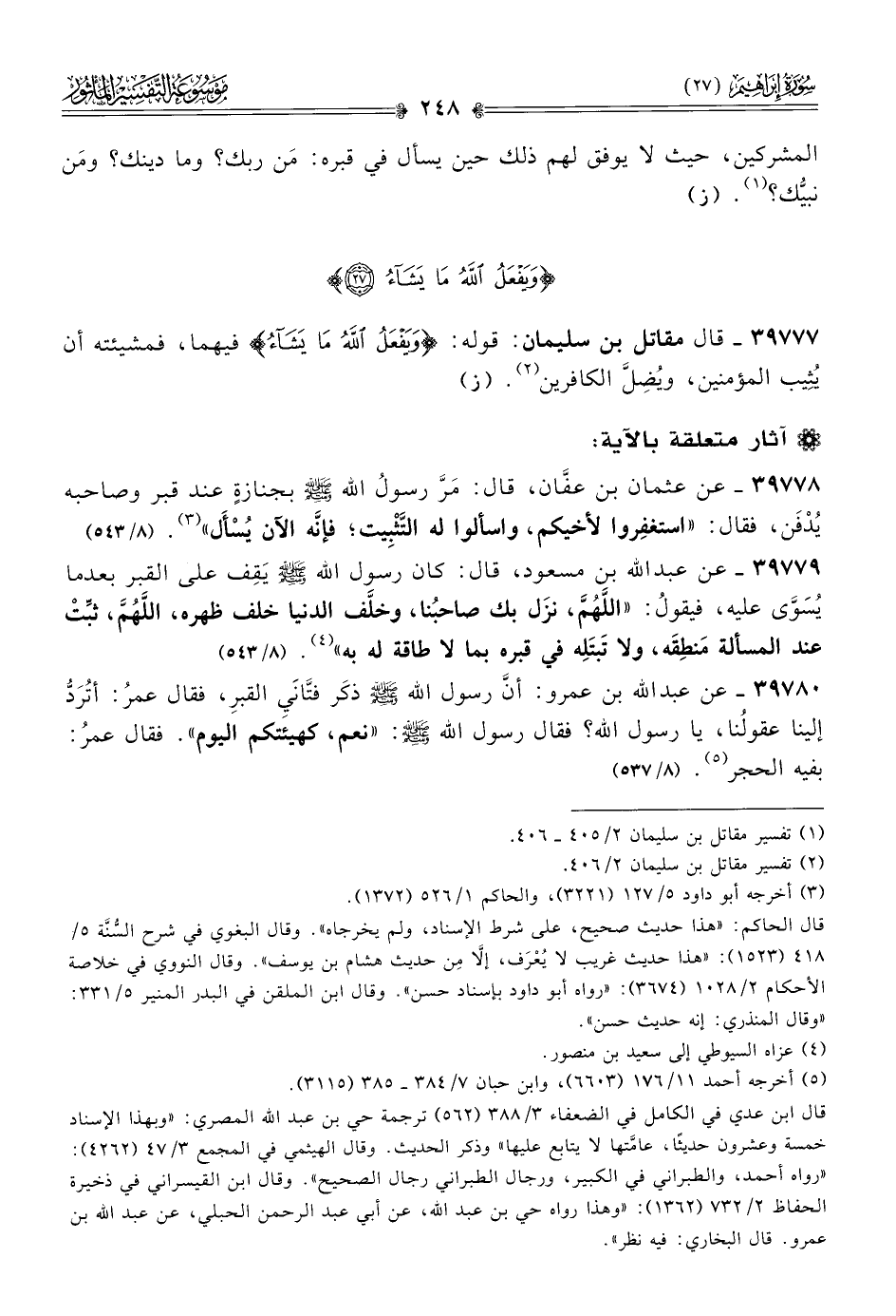 ٣٩٧٧٨ - عن عثمان بن عفّان، قال: مَرَّ رسولُ الله - صلى الله عليه وسلم - بجنازةٍ عند قبر وصاحبه يُدْفَن، فقال: «استغفِروا لأخيكم، واسألوا له التَّثْبِيت؛ فإنّه الآن يُسْأَل» (¬٣). (٨/ ٥٤٣)
