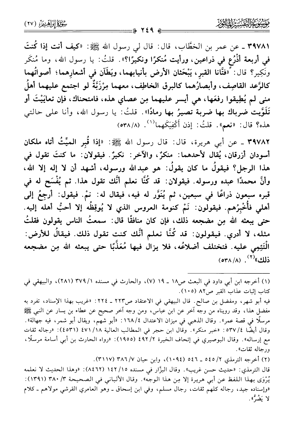 ٣٩٧٨٢ - عن أبي هريرة، قال: قال رسول الله - صلى الله عليه وسلم -: «إذا قُبِر الميِّتُ أتاه ملكان أسودان أزرقان، يُقال لأحدهما: منكرٌ، والآخر: نكيرٌ. فيقولان: ما كنتَ تقول في هذا الرجل؟ فيقولُ ما كان يقولُ: هو عبد الله ورسوله، أشهد أن لا إله إلا الله، وأنّ محمدًا عبده ورسوله. فيقولان: قد كُنّا نعلم أنّك تقول هذا. ثم يُفْسَح له في قبره سبعون ذراعًا في سبعين، ثم يُنَوَّر له فيه، فيقال له: نمْ. فيقول: أرجِعُ إلى أهلي فأُخْبِرُهم. فيقولون: نَمْ كنومة العروس الذي لا يُوقِظُه إلا أحبُّ أهله إليه. حتى يبعثه الله مِن مضجعه ذلك، فإن كان منافقًا قال: سمعتُ الناس يقولون فقلتُ مثله، لا أدري. فيقولون: قد كُنّا نعلم أنّك كنت تقول ذلك. فيقالُ للأرض: التَئِمِي عليه. فتختلف أضلاعُه، فلا يزال فيها مُعَذَّبًا حتى يبعثه الله مِن مضجعه ذلك» (¬٢). (٨/ ٥٣٨)