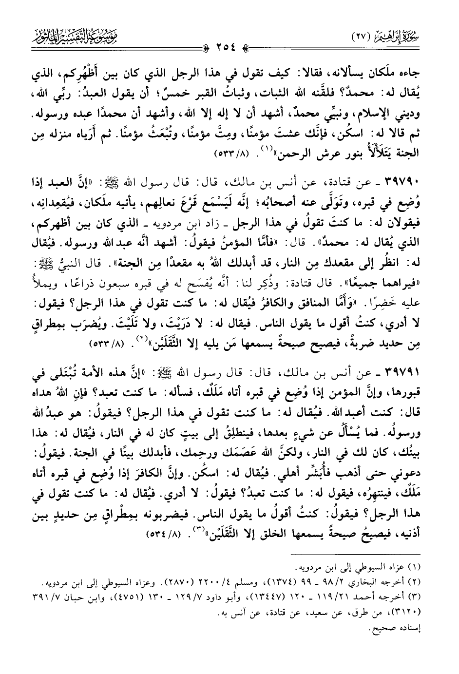 ٣٩٧٩٠ - عن قتادة، عن أنس بن مالك، قال: قال رسول الله - صلى الله عليه وسلم -: «إنّ العبد إذا وُضِع في قبره، وتَوَلّى عنه أصحابُه؛ إنّه لَيَسْمَع قَرْعَ نعالِهم، يأتيه ملَكان، فيُقعِدانِه، فيقولان له: ما كنتَ تقولُ في هذا الرجل -زاد ابن مردويه- الذي كان بين أظهركم، الذي يُقال له: محمدٌ». قال: «فأمّا المؤمنُ فيقولُ: أشهد أنّه عبد الله ورسوله. فيُقال له: انظُر إلى مقعدك مِن النار، قد أبدلك اللهُ به مقعدًا مِن الجنة». قال النبيُّ - صلى الله عليه وسلم -: «فيراهما جميعًا». قال قتادة: وذُكِر لنا: أنّه يُفسَح له في قبره سبعون ذراعًا، ويملأُ عليه خَضِرًا. «وأَمّا المنافق والكافرُ فيُقال له: ما كنت تقول في هذا الرجل؟ فيقول: لا أدري، كنتُ أقول ما يقول الناس. فيقال له: لا دَرَيْتَ، ولا تَلَيْتَ. ويُضرَب بمِطراقٍ مِن حديد ضربةً، فيصيح صيحةً يسمعها مَن يليه إلا الثَّقَلَيْن» (¬٢). (٨/ ٥٣٣)