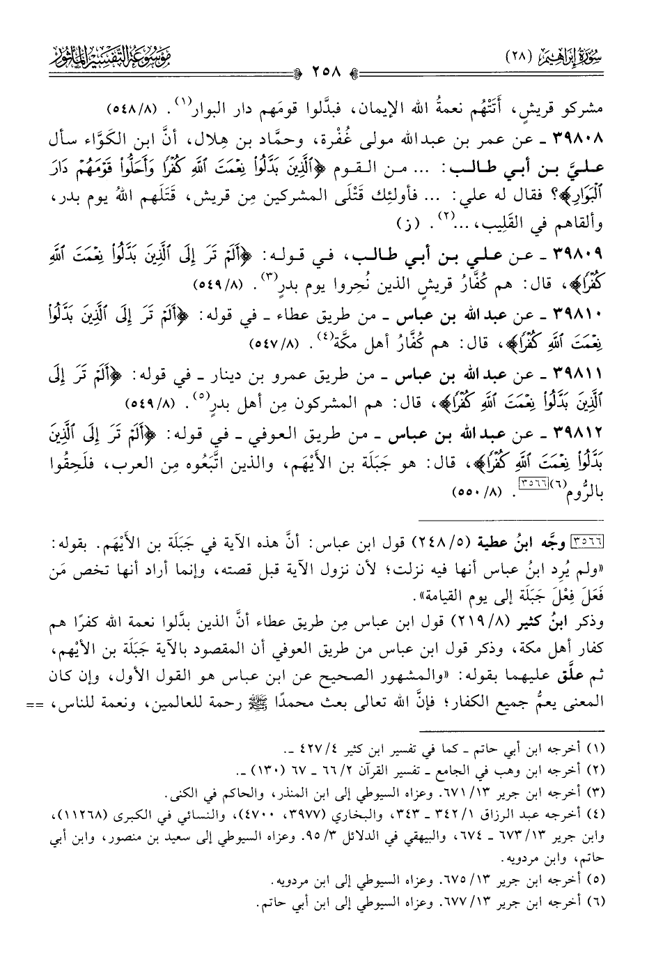 ٣٩٨٠٩ - عن علي بن أبي طالب، في قوله: {ألم تر إلى الذين بدَّلوا نعمة الله كفرًا}، قال: هم كُفّارُ قريشٍ الذين نُحِروا يوم بدرٍ (¬٣). (٨/ ٥٤٩)