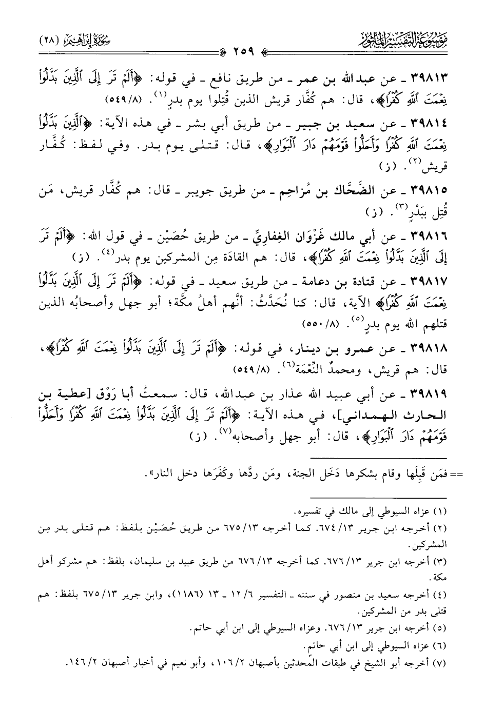 ٣٩٨١٧ - عن قتادة بن دعامة -من طريق سعيد- في قوله: {ألم تر إلى الذين بدلوا نعمة الله كفرًا} الآية، قال: كنا نُحَدَّثُ: أنّهم أهلُ مكَّة؛ أبو جهل وأصحابُه الذين قتلهم الله يوم بدرٍ (¬٥). (٨/ ٥٥٠)