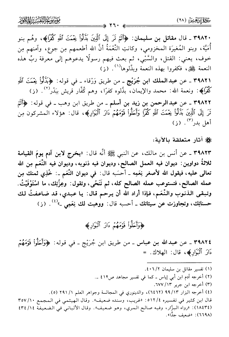 ٣٩٨٢٢ - عن عبد الرحمن بن زيد بن أسلم -من طريق ابن وهب- في قوله: {ألم تر إلى الذين بدلوا نعمة الله كفرا وأحلوا قومهم دار البوار}، قال: هؤلاء المشركون مِن أهل بدر (¬٣). (ز)