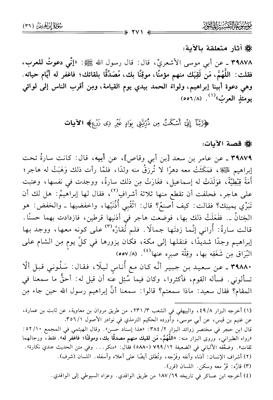 ٣٩٨٧٨ - عن أبي موسى الأشعريِّ، قال: قال رسول الله - صلى الله عليه وسلم -: «إنِّي دعوتُ للعرب، فقلت: اللَّهُمَّ، مَن لَقِيَك منهم مؤمنًا، موقِنًا بك، مُصَدِّقًا بلقائك؛ فاغفر له أيّام حياته. وهي دعوة أبينا إبراهيم، ولواءُ الحمد بيدي يوم القيامة، ومِن أقرب الناس إلى لوائي يومئذٍ العربُ» (¬١). (٨/ ٥٥٦)