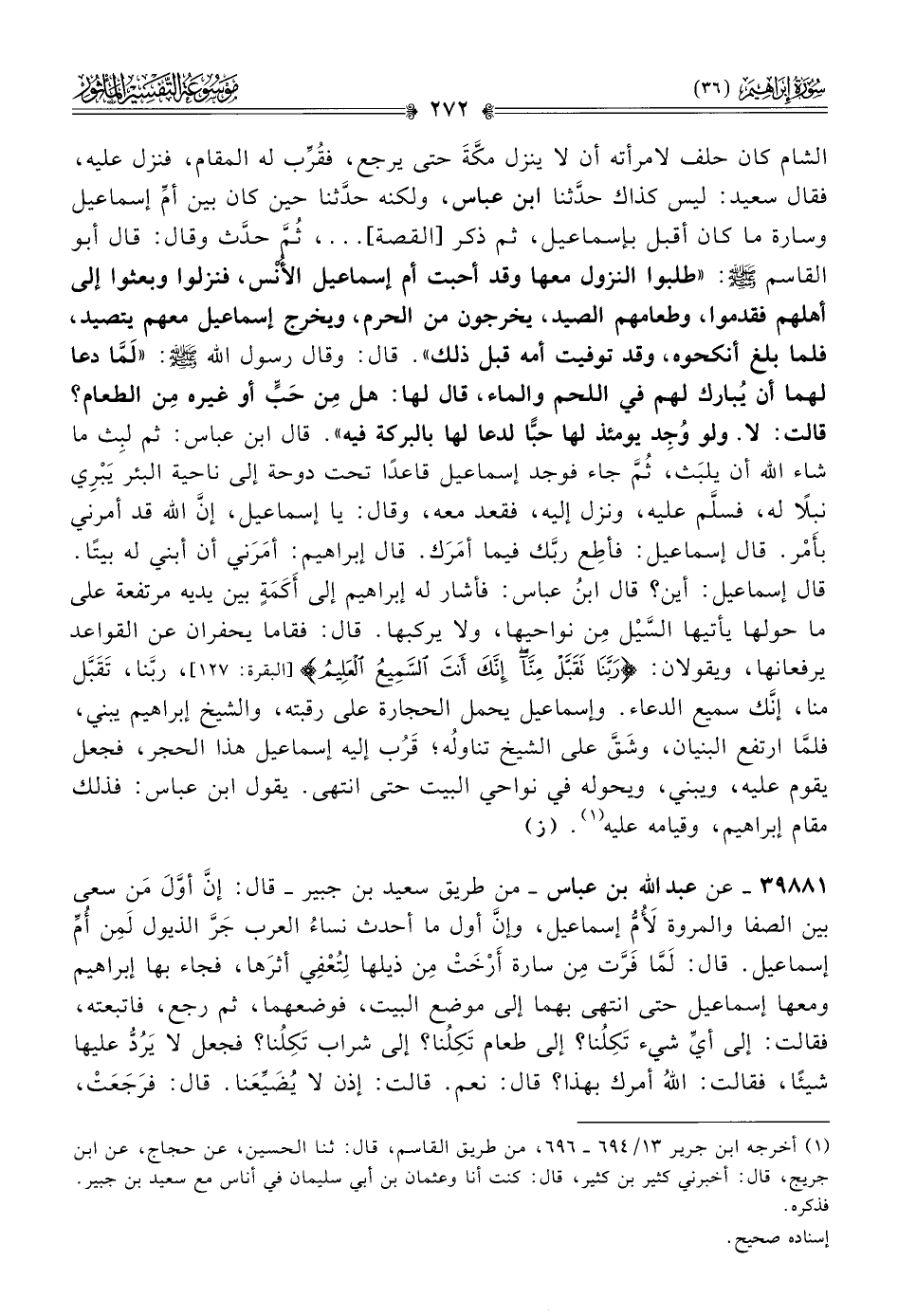 ٣٩٨٨١ - عن عبد الله بن عباس -من طريق سعيد بن جبير- قال: إنّ أوَّلَ مَن سعى بين الصفا والمروة لَأُمُّ إسماعيل، وإنّ أول ما أحدث نساءُ العرب جَرَّ الذيول لَمِن أُمِّ إسماعيل. قال: لَمّا فَرَّت مِن سارة أرْخَتْ مِن ذيلها لِتُعْفِي أثرَها، فجاء بها إبراهيم ومعها إسماعيل حتى انتهى بهما إلى موضع البيت، فوضعهما، ثم رجع، فاتبعته، فقالت: إلى أيِّ شيء تَكِلُنا؟ إلى طعام تَكِلُنا؟ إلى شراب تَكِلُنا؟ فجعل لا يَرُدُّ عليها شيئًا، فقالت: اللهُ أمرك بهذا؟ قال: نعم. قالت: إذن لا يُضَيِّعَنا. قال: فرَجَعَتْ،