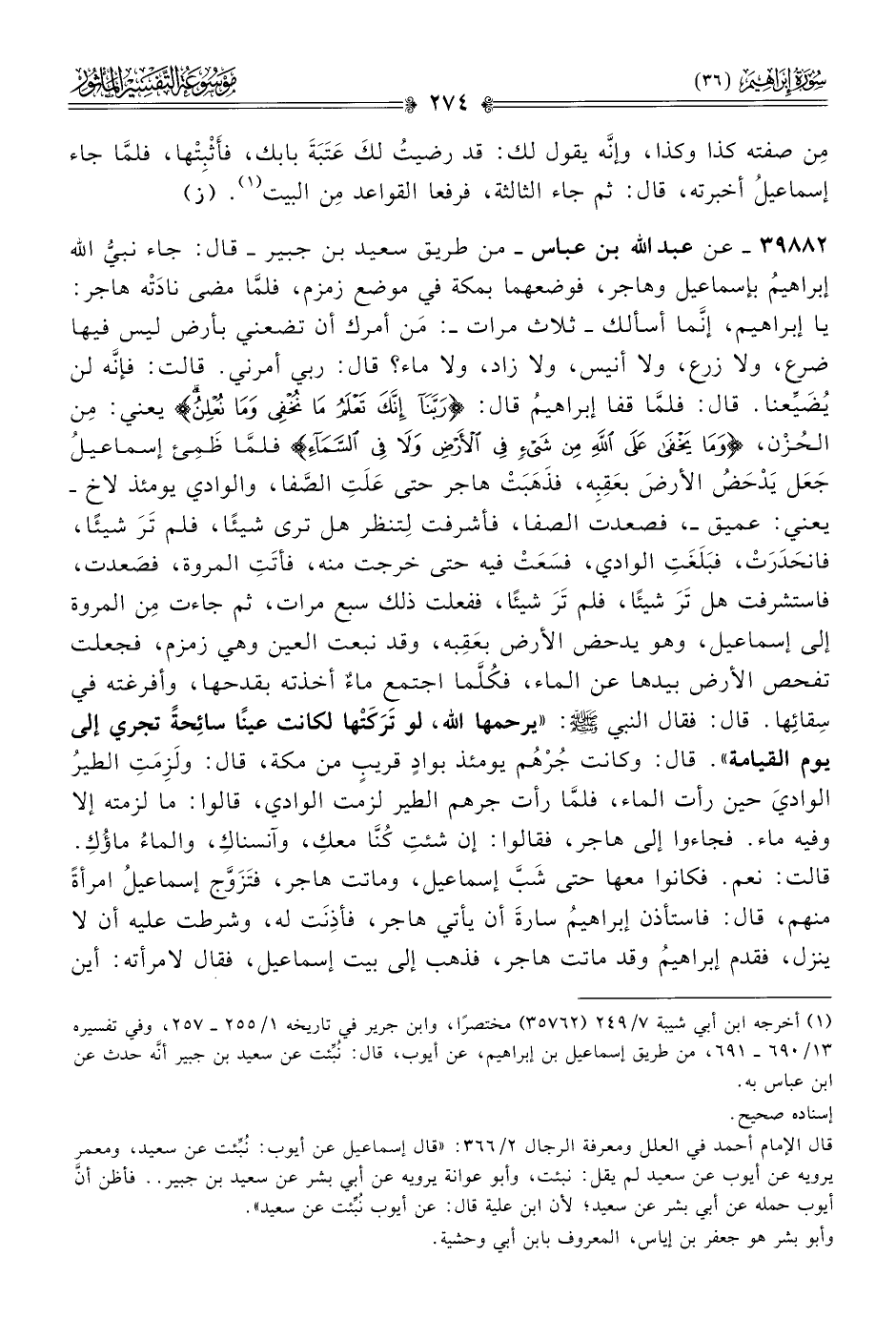 ٣٩٨٨٢ - عن عبد الله بن عباس -من طريق سعيد بن جبير- قال: جاء نبيُّ الله إبراهيمُ بإسماعيل وهاجر، فوضعهما بمكة في موضع زمزم، فلمّا مضى نادَتْه هاجر: يا إبراهيم، إنّما أسألك -ثلاث مرات-: مَن أمرك أن تضعني بأرض ليس فيها ضرع، ولا زرع، ولا أنيس، ولا زاد، ولا ماء؟ قال: ربي أمرني. قالت: فإنّه لن يُضَيِّعنا. قال: فلمّا قفا إبراهيمُ قال: {ربنا إنك تعلم ما نخفي وما نعلن} يعني: مِن الحُزْن، {وما يخفى على الله من شيء في الأرض ولا في السماء} فلمّا ظَمِئ إسماعيلُ جَعَل يَدْحَضُ الأرضَ بعَقِبِه، فذَهَبَتْ هاجر حتى عَلَتِ الصَّفا، والوادي يومئذ لاخ -يعني: عميق-، فصعدت الصفا، فأشرفت لِتنظر هل ترى شيئًا، فلم تَرَ شيئًا، فانحَدَرَتْ، فبَلَغَتِ الوادي، فسَعَتْ فيه حتى خرجت منه، فأتَتِ المروة، فصَعدت، فاستشرفت هل تَرَ شيئًا، فلم تَرَ شيئًا، ففعلت ذلك سبع مرات، ثم جاءت مِن المروة إلى إسماعيل، وهو يدحض الأرض بعَقِبه، وقد نبعت العين وهي زمزم، فجعلت تفحص الأرض بيدها عن الماء، فكُلَّما اجتمع ماءٌ أخذته بقدحها، وأفرغته في سِقائِها. قال: فقال النبي - صلى الله عليه وسلم -: «يرحمها الله، لو تَرَكَتْها لكانت عينًا سائِحةً تجري إلى يوم القيامة». قال: وكانت جُرْهُم يومئذ بوادٍ قريبٍ من مكة، قال: ولَزِمَتِ الطيرُ الواديَ حين رأت الماء، فلمّا رأت جرهم الطير لزمت الوادي، قالوا: ما لزمته إلا وفيه ماء. فجاءوا إلى هاجر، فقالوا: إن شئتِ كُنّا معكِ، وآنسناكِ، والماءُ ماؤُكِ. قالت: نعم. فكانوا معها حتى شَبَّ إسماعيل، وماتت هاجر، فتَزَوَّج إسماعيلُ امرأةً منهم، قال: فاستأذن إبراهيمُ سارةَ أن يأتي هاجر، فأذِنَت له، وشرطت عليه أن لا ينزل، فقدم إبراهيمُ وقد ماتت هاجر، فذهب إلى بيت إسماعيل، فقال لامرأته: أين