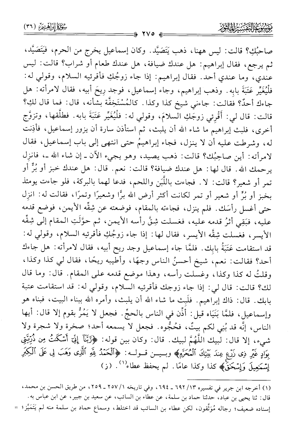 (¬١) أخرجه ابن جرير في تفسيره ١٣/ ٦٩٢ - ٦٩٤، وفي تاريخه ١/ ٢٥٧ - ٢٥٩، من طريق الحسن بن محمد، قال: ثنا يحيى بن عباد، حدثنا حماد بن سلمة، عن عطاء بن السائب، عن سعيد بن جبير، عن ابن عباس به.
