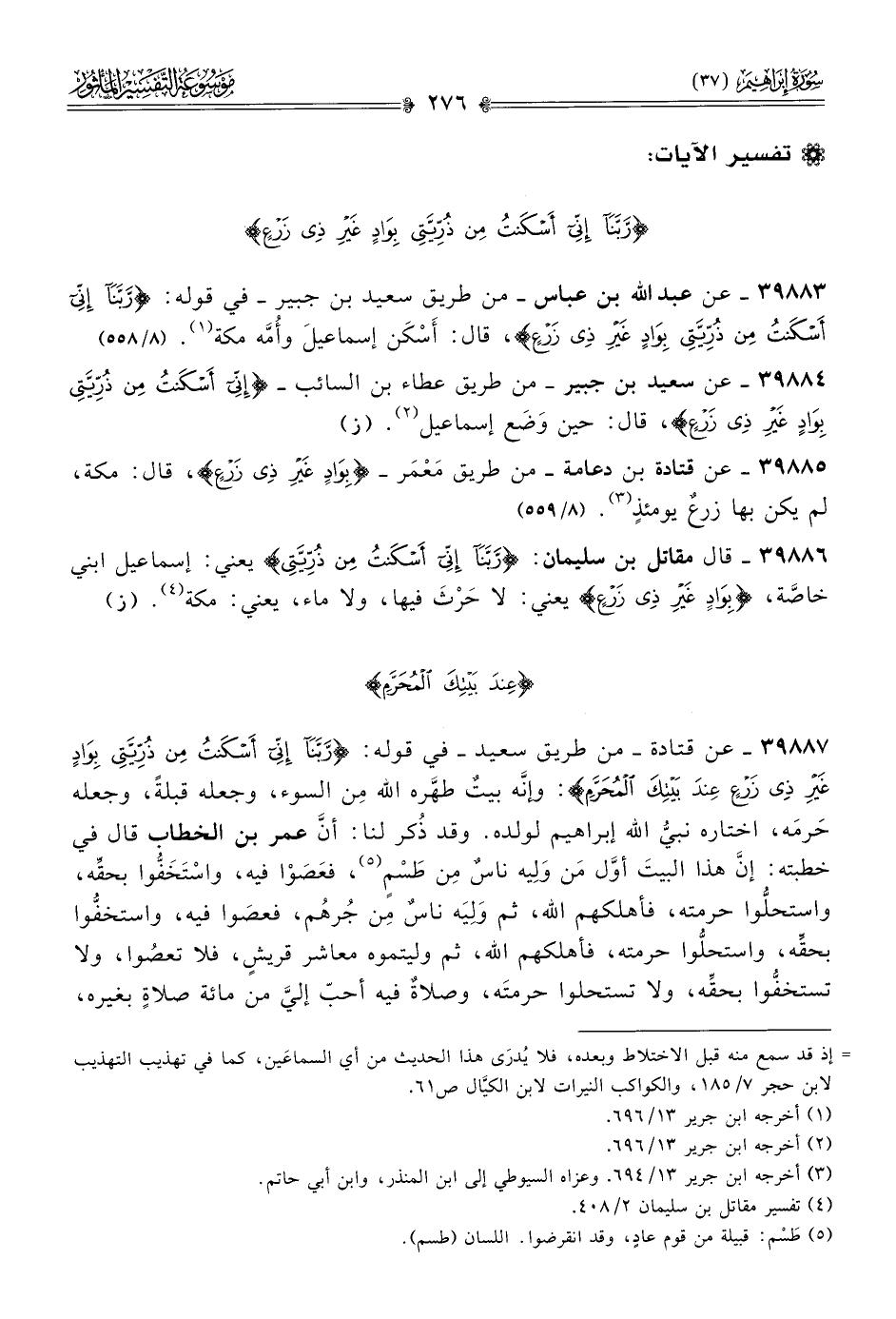 ٣٩٨٨٤ - عن سعيد بن جبير -من طريق عطاء بن السائب- {إني أسكنت من ذريتي بواد غير ذي زرع}، قال: حين وضَع إسماعيل (¬٢). (ز)