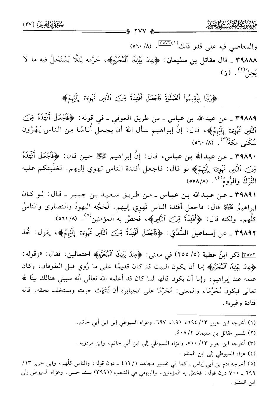 ٣٩٨٨٩ - عن عبد الله بن عباس -من طريق العوفي- في قوله: {فاجعل أفئدةً مِّن النّاسِ تهوي إليهم}، قال: إنّ إبراهيم سأل اللهَ أن يجعل أُناسًا مِن الناس يَهْوُون سُكْنى مكةَ (¬٣). (٨/ ٥٦٠)