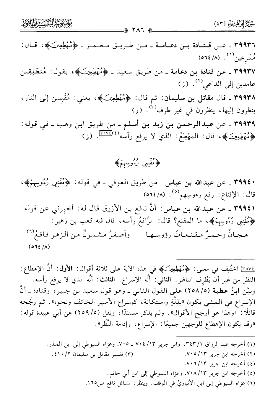 ٣٩٩٣٦ - عن قتادة بن دعامة -من طريق معمر- {مُهطعين}، قال: مُسْرِعين (¬١). (٨/ ٥٦٤)