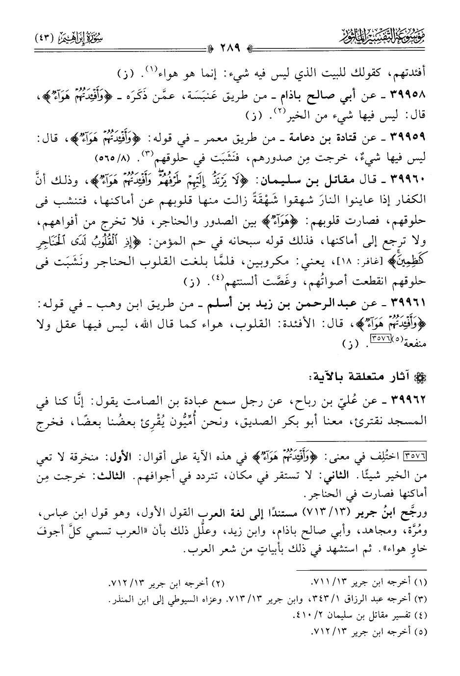 ٣٩٩٥٨ - عن أبي صالح باذام -من طريق عَنبَسَة، عمَّن ذَكَرَه- {وأفئدتهم هواء}، قال: ليس فيها شيء من الخير (¬٢). (ز)