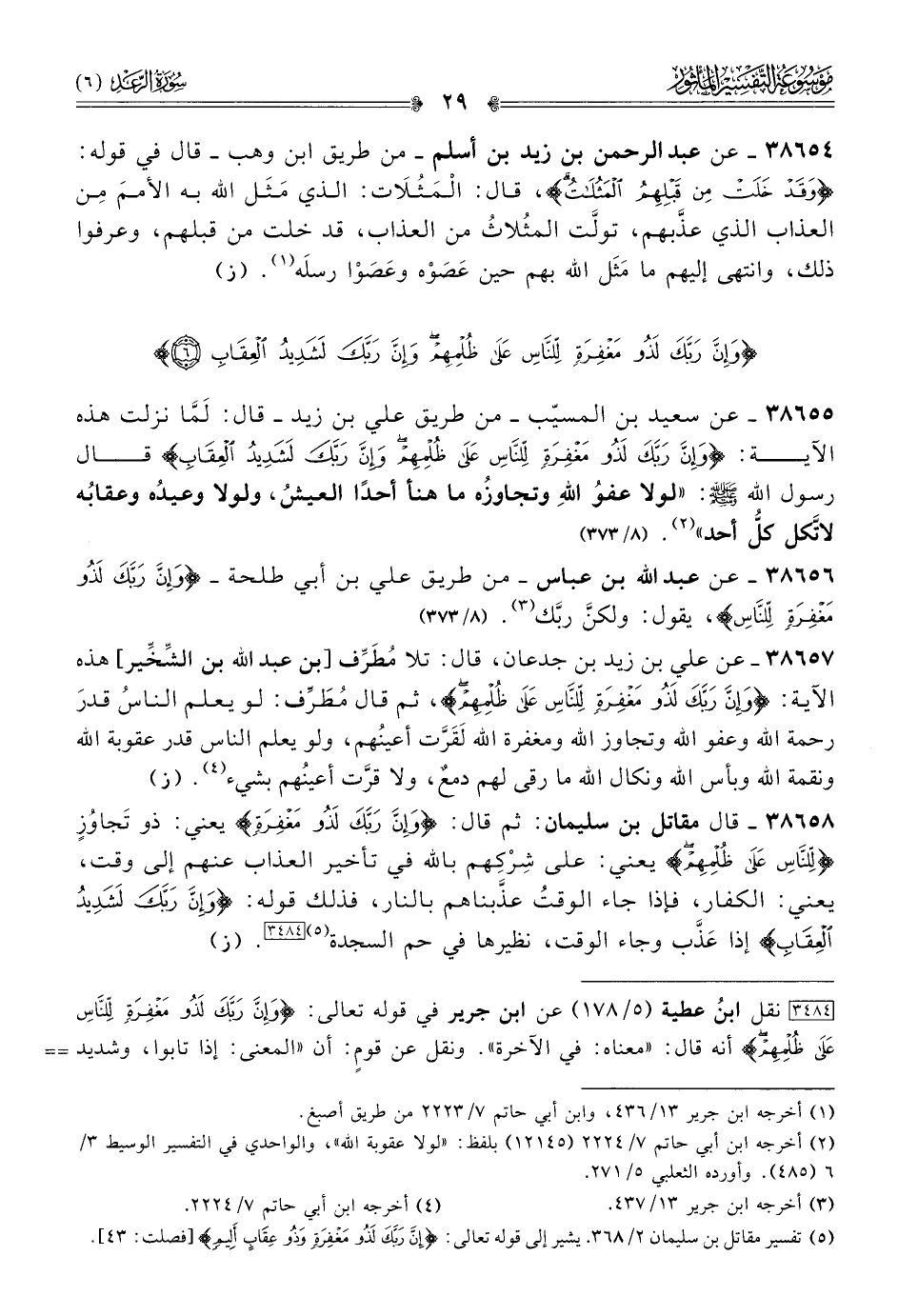 ٣٨٦٥٦ - عن عبد الله بن عباس -من طريق علي بن أبي طلحة- {وإن ربَّك لذو مغفرة للناس}، يقول: ولكنَّ ربَّك (¬٣).