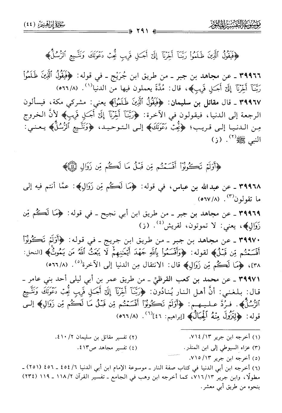 ٣٩٩٧٠ - عن مجاهد بن جبر -من طريق ابن جريج- في قوله: {أولم تكونوا أقسمتم من قبل} لقوله: {وأقسموا بالله جهد أيمانهم لا يبعث الله من يموت} [النحل: ٣٨]، {ما لكم من زوالٍ} قال: الانتقال مِن الدنيا إلى الآخرة (¬٥). (٨/ ٥٦٦)