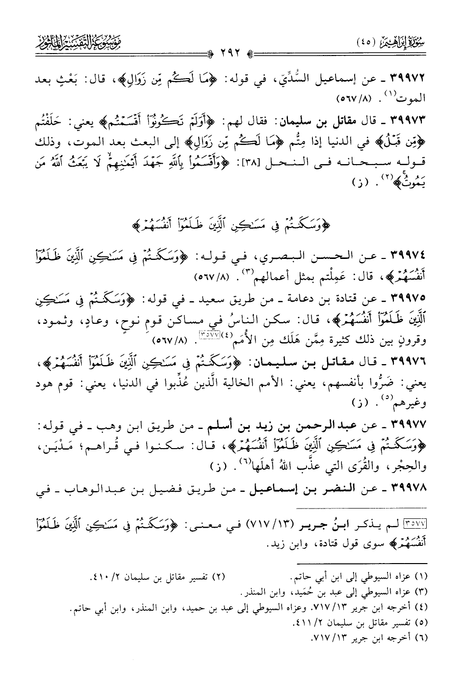 ٣٩٩٧٥ - عن قتادة بن دعامة -من طريق سعيد- في قوله: {وسكنتم في مساكن الذين ظلموا أنفسهم}، قال: سكن الناسُ في مساكن قومِ نوحٍ، وعادٍ، وثمود، وقرونٍ بين ذلك كثيرة مِمَّن هَلَك مِن الأُمَم (¬٤) [٣٥٧٧]. (٨/ ٥٦٧)
