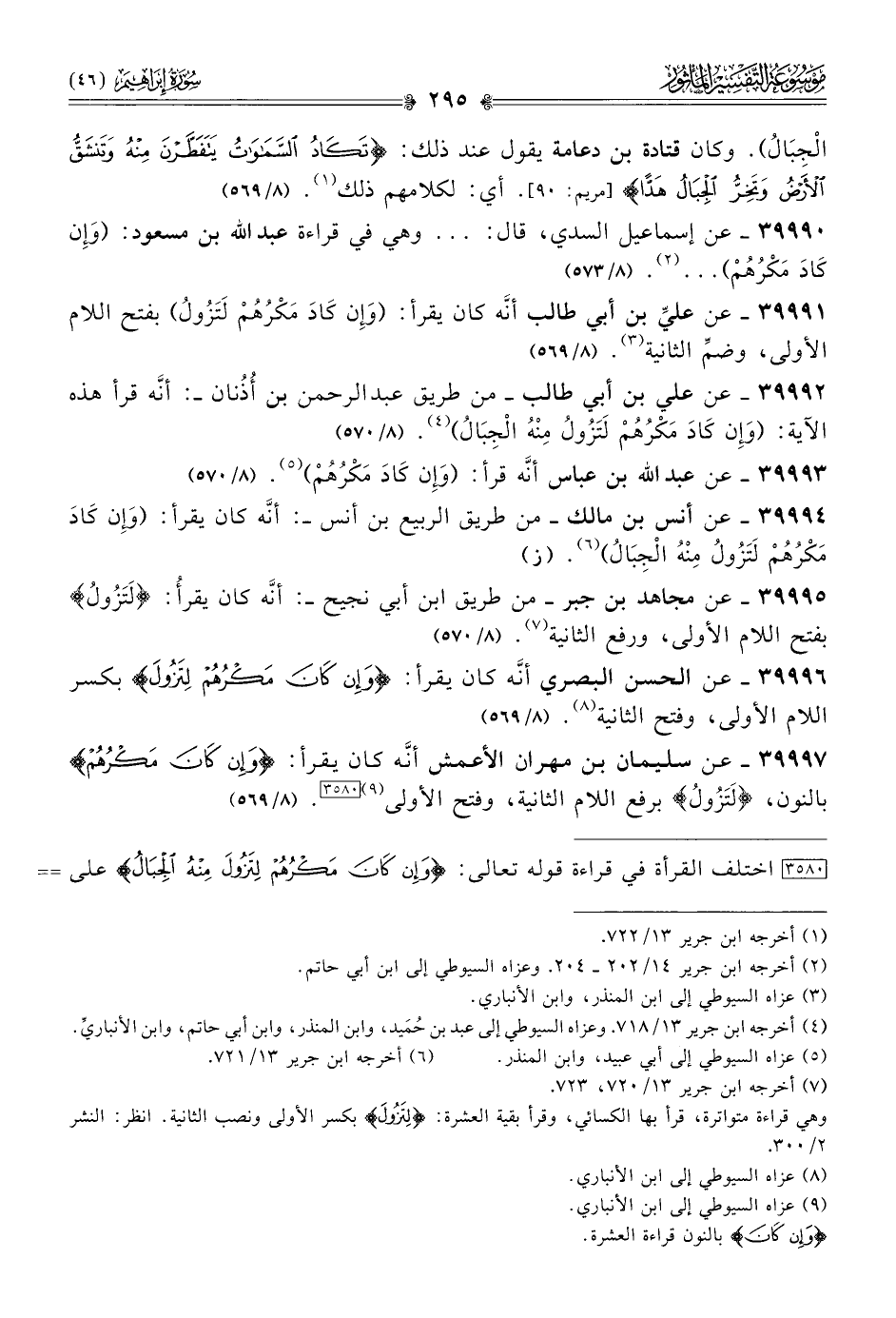 ٣٩٩٩٧ - عن سليمان بن مهران الأعمش أنّه كان يقرأ: {وإن كانَ مَكْرُهُمْ} بالنون، «لَتَزُولُ» برفع اللام الثانية، وفتح الأولى (¬٩) [٣٥٨٠]. (٨/ ٥٦٩)