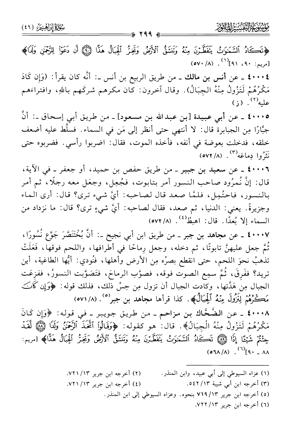 ٤٠٠٠٨ - عن الضَّحّاك بن مزاحم -من طريق جويبر- في قوله: «وإن كانَ مَكْرُهُمْ لَتَزُولُ مِنهُ الجِبالُ». قال: هو كقوله: {وقالوا اتَّخذ الرحمنُ ولدًا* لقد جئتم شيئًا إدًّا* تكادُ السموات يتفطَّرن منه وتنشقُّ الأرض وتخِرُّ الجبال هدًّا} [مريم: ٨٨ - ٩٠] (¬٦). (٨/ ٥٦٨)