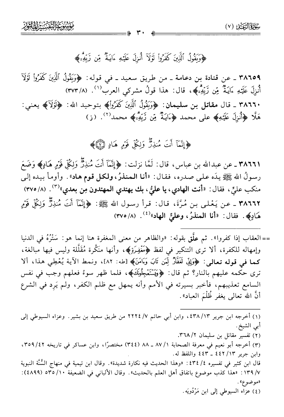 ٣٨٦٦١ - عن عبد الله بن عباس، قال: لَمّا نزلت: {إنّما أنت منذرٌ ولكل قومٍ هادٍ} وضَعَ رسولُ الله - صلى الله عليه وسلم - يدَه على صدره، فقال: «أنا المنذرُ، ولكل قوم هاد». وأومأ بيده إلى منكب عليٍّ، فقال: «أنت الهادي، يا عليُّ، بك يهتدي المهتدون مِن بعدي» (¬٣). (٨/ ٣٧٥)