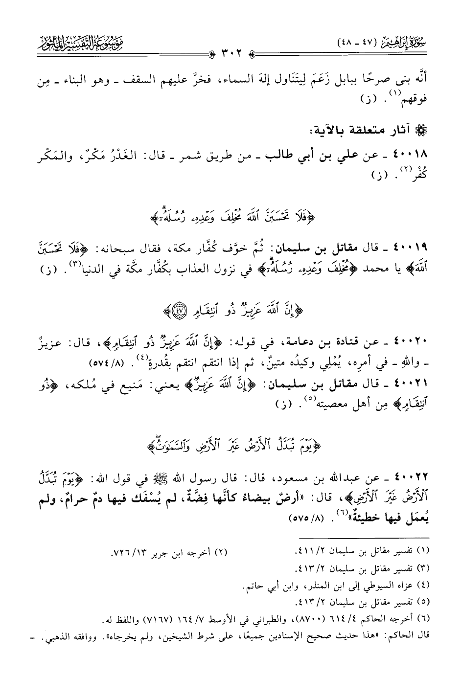 ٤٠٠٢٠ - عن قتادة بن دعامة، في قوله: {إن الله عزيزٌ ذو انتقامٍ}، قال: عزيزٌ -واللهِ- في أمرِه، يُمْلِي وكيدُه متينٌ، ثم إذا انتقم انتقم بقُدرةٍ (¬٤). (٨/ ٥٧٤)