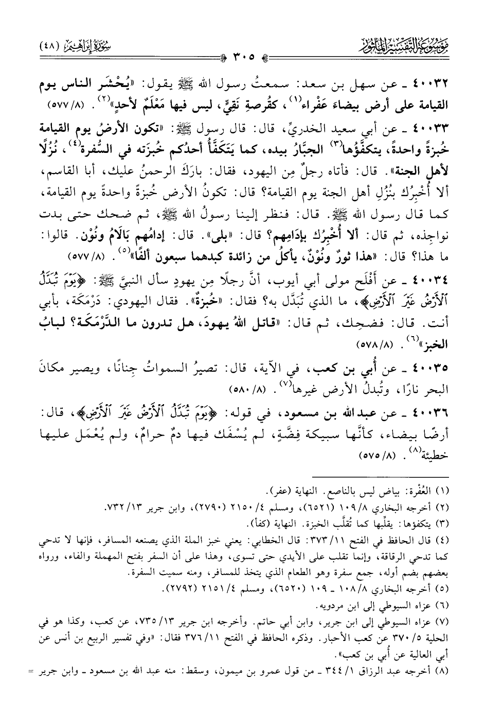 ٤٠٠٣٤ - عن أفْلَح مولى أبي أيوب، أنّ رجلًا مِن يهودٍ سأل النبيَّ - صلى الله عليه وسلم -: {يوم تبدل الأرض غير الأرض}، ما الذي تُبَدَّل به؟ فقال: «خُبزةٌ». فقال اليهودي: دَرْمَكَة، بأبي أنت. قال: فضحِك، ثم قال: «قاتل اللهُ يهودَ، هل تدرون ما الدَّرْمَكَة؟ لبابُ الخبز» (¬٦). (٨/ ٥٧٨)