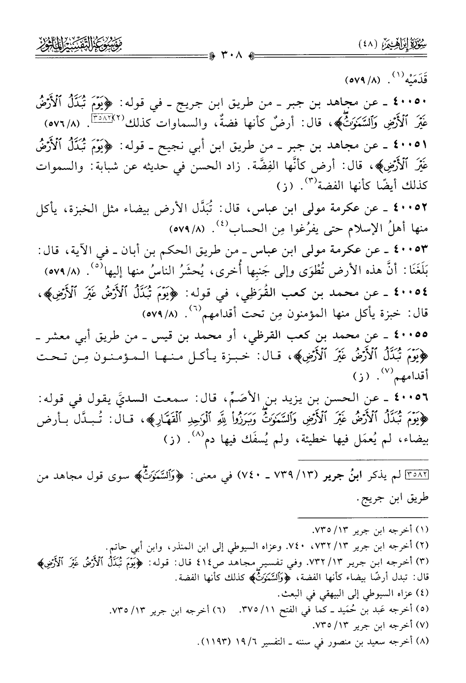 ٤٠٠٥٠ - عن مجاهد بن جبر -من طريق ابن جريج- في قوله: {يوم تبدل الأرض غير الأرض والسماوات}، قال: أرضٌ كأنها فضةٌ، والسماوات كذلك (¬٢) [٣٥٨٢]. (٨/ ٥٧٦)