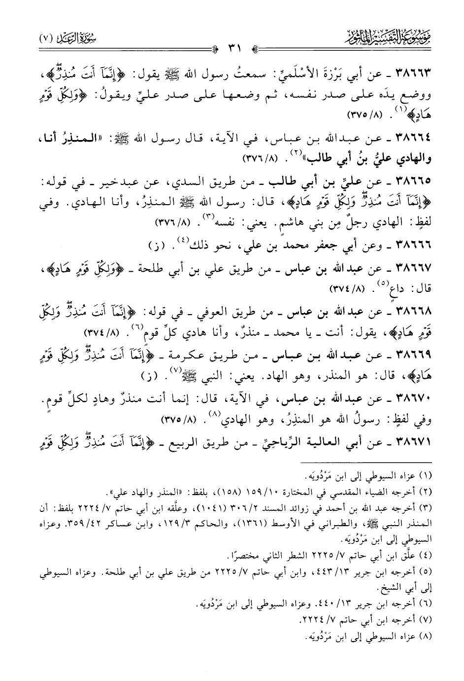 ٣٨٦٧٠ - عن عبد الله بن عباس، في الآية، قال: إنما أنت منذرٌ وهادٍ لكلِّ قومٍ. وفي لفظٍ: رسولُ الله هو المنذِرُ، وهو الهادي (¬٨). (٨/ ٣٧٥)