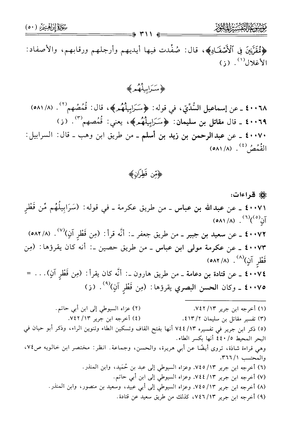 ٤٠٠٦٨ - عن إسماعيل السُّدِّيّ، في قوله: {سرابيلهُمُ}، قال: قُمُصُهم (¬٢). (٨/ ٥٨١)