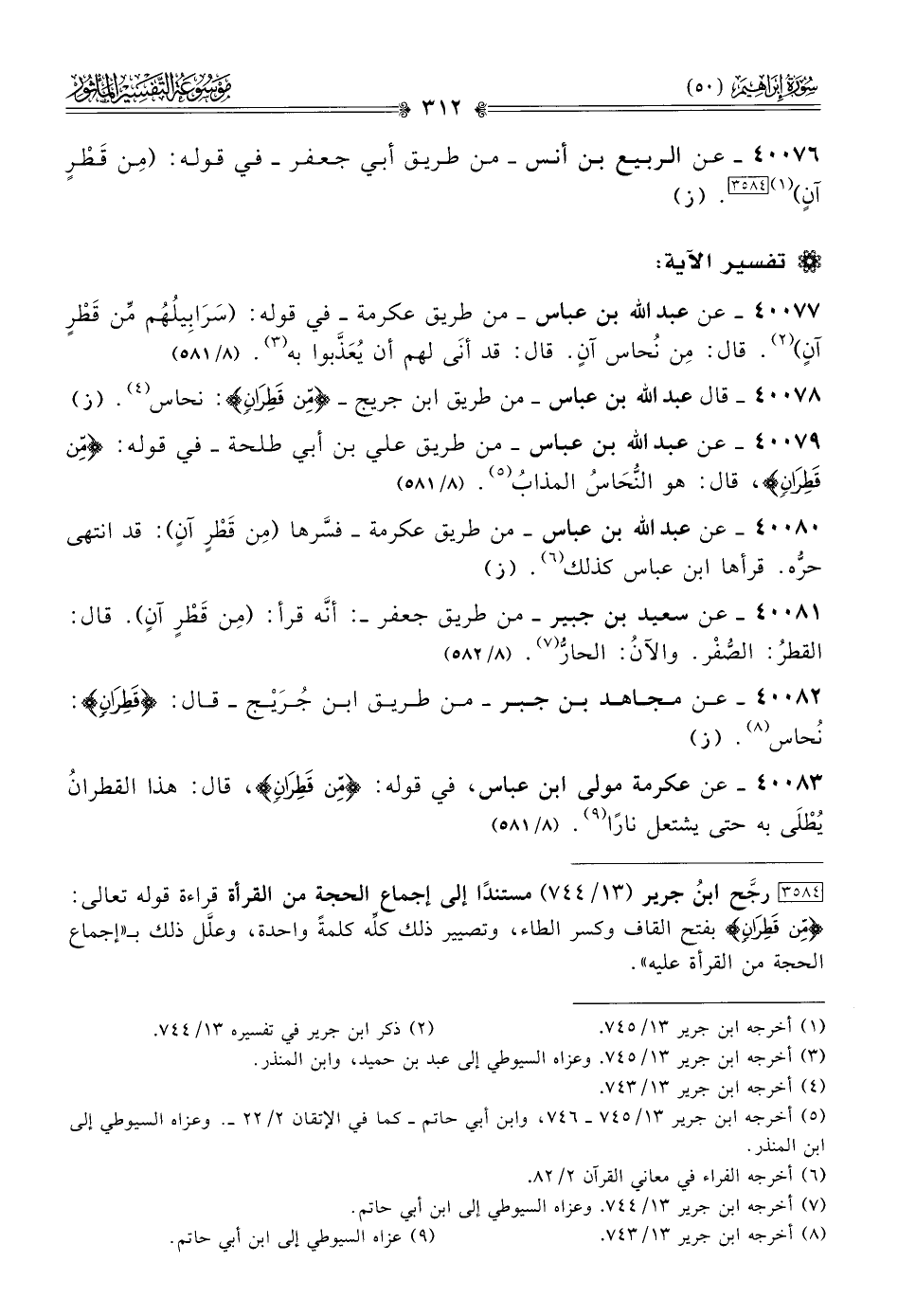 ٤٠٠٧٧ - عن عبد الله بن عباس -من طريق عكرمة- في قوله: (سَرابِيلُهُم مِّن قَطْرٍ آنٍ) (¬٢). قال: مِن نُحاس آنٍ. قال: قد أنى لهم أن يُعَذَّبوا به (¬٣). (٨/ ٥٨١)