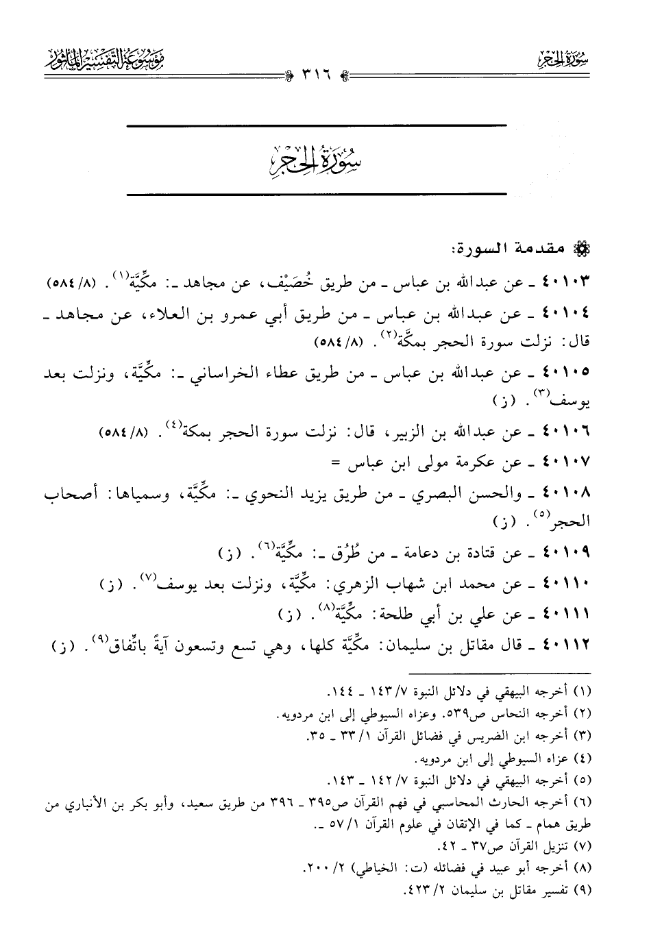 ٤٠١٠٦ - عن عبد الله بن الزبير، قال: نزلت سورة الحجر بمكة (¬٤). (ز)