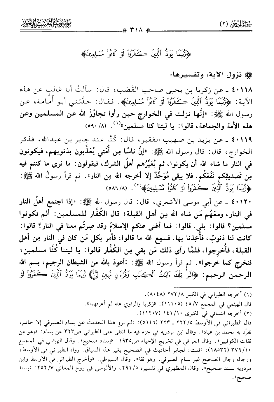 ٤٠١١٨ - عن زكريا بن يحيى صاحب القَصَب، قال: سألتُ أبا غالبٍ عن هذه الآية: {ربما يود الذين كفروا لو كانوا مسلمين}. فقال: حدَّثني أبو أُمامة، عن رسول الله - صلى الله عليه وسلم -: «إنّها نزلت في الخوارج حين رأوا تجاوُزَ الله عن المسلمين وعن هذه الأمة والجماعة، قالوا: يا ليتنا كنا مسلمين» (¬١). (٨/ ٥٩٠)