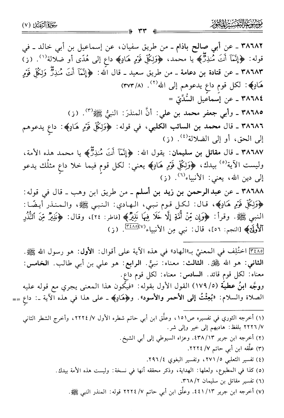 [٣٤٨٥] اختُلِف في المعنيِّ بـ «الهاد» في هذه الآية على أقوال: الأول: هو رسول الله - صلى الله عليه وسلم -. الثاني: هو الله - عز وجل -. الثالث: معناه: نبيٌّ. الرابع: هو علي بن أبي طالب. الخامس: معناه: لكل قومٍ قائد. السادس: معناه: لكل قوم داعٍ.