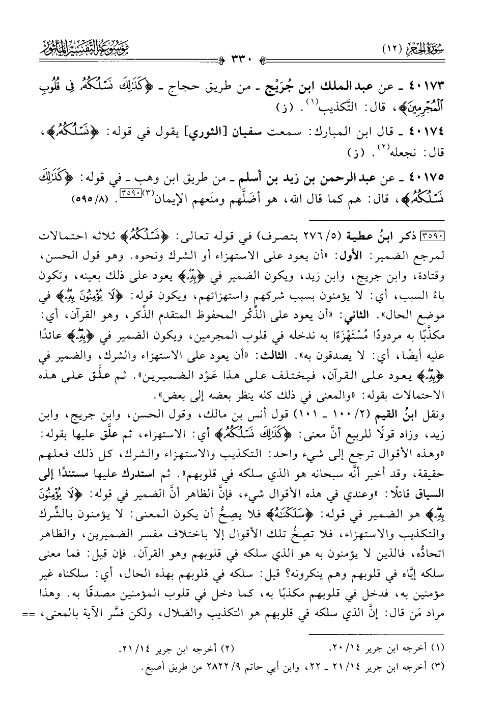 ٤٠١٧٥ - عن عبد الرحمن بن زيد بن أسلم -من طريق ابن وهب- في قوله: {كذلك نسلكه}، قال: هم كما قال الله، هو أضَلَّهم ومنَعهم الإيمان (¬٣) [٣٥٩٠]. (٨/ ٥٩٥)