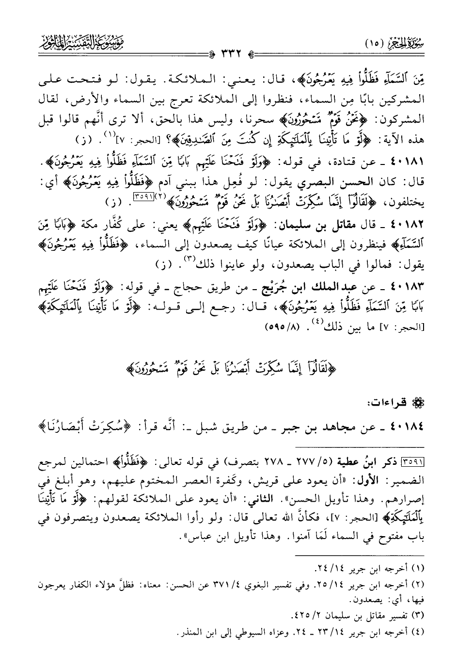 ٤٠١٨١ - عن قتادة، في قوله: {ولو فتحنا عليهم بابا من السماء فظلوا فيه يعرجون}. قال: كان الحسن البصري يقول: لو فُعِل هذا ببني آدم {فظلوا فيه يعرجون} أي: يختلفون، {لقالوا: إنما سكرت أبصارنا بل نحن قوم مسحورون} (¬٢) [٣٥٩١]. (ز)