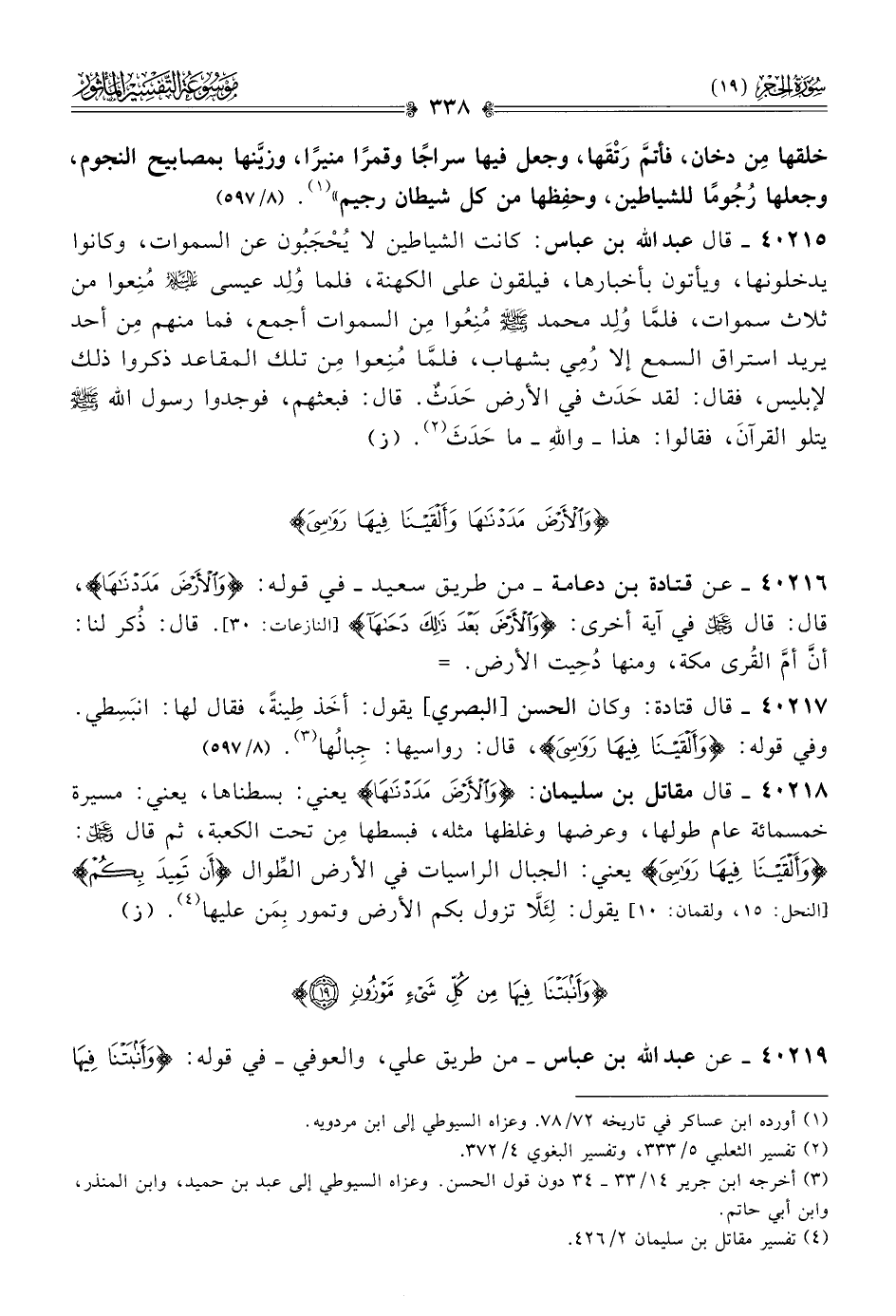 ٤٠٢١٧ - قال قتادة: وكان الحسن [البصري] يقول: أخَذ طِينةً، فقال لها: انبَسِطي. وفي قوله: {وألقينا فيها رواسي}، قال: رواسيها: جِبالُها (¬٣). (٨/ ٥٩٧)