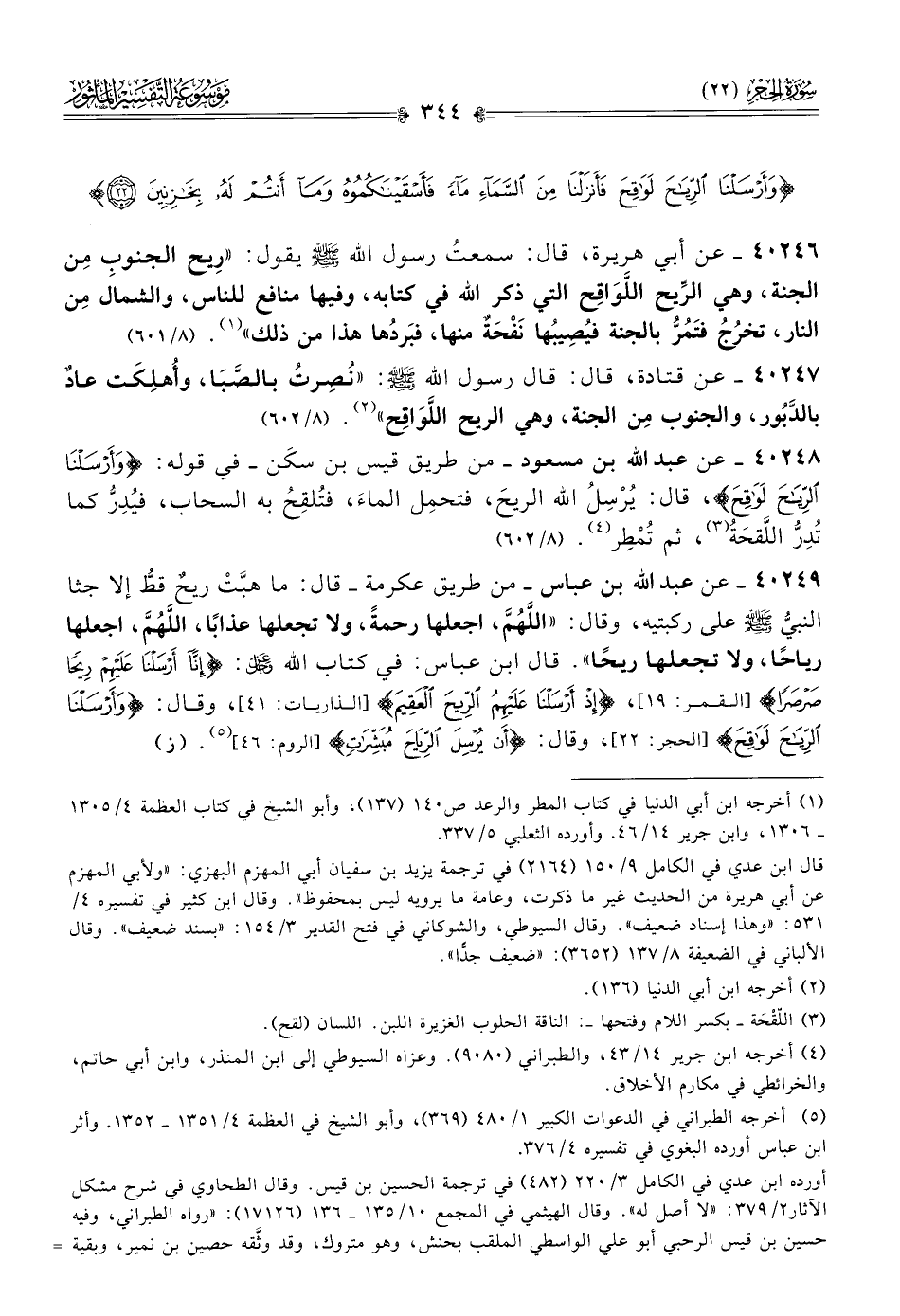 ٤٠٢٤٦ - عن أبي هريرة، قال: سمعتُ رسول الله - صلى الله عليه وسلم - يقول: «رِيح الجنوبِ مِن الجنة، وهي الرِّيح اللَّواقِح التي ذكر الله في كتابه، وفيها منافع للناس، والشمال مِن النار، تخرُجُ فتَمُرُّ بالجنة فيُصِيبُها نَفْحَةٌ منها، فبَردُها هذا من ذلك» (¬١). (٨/ ٦٠١)