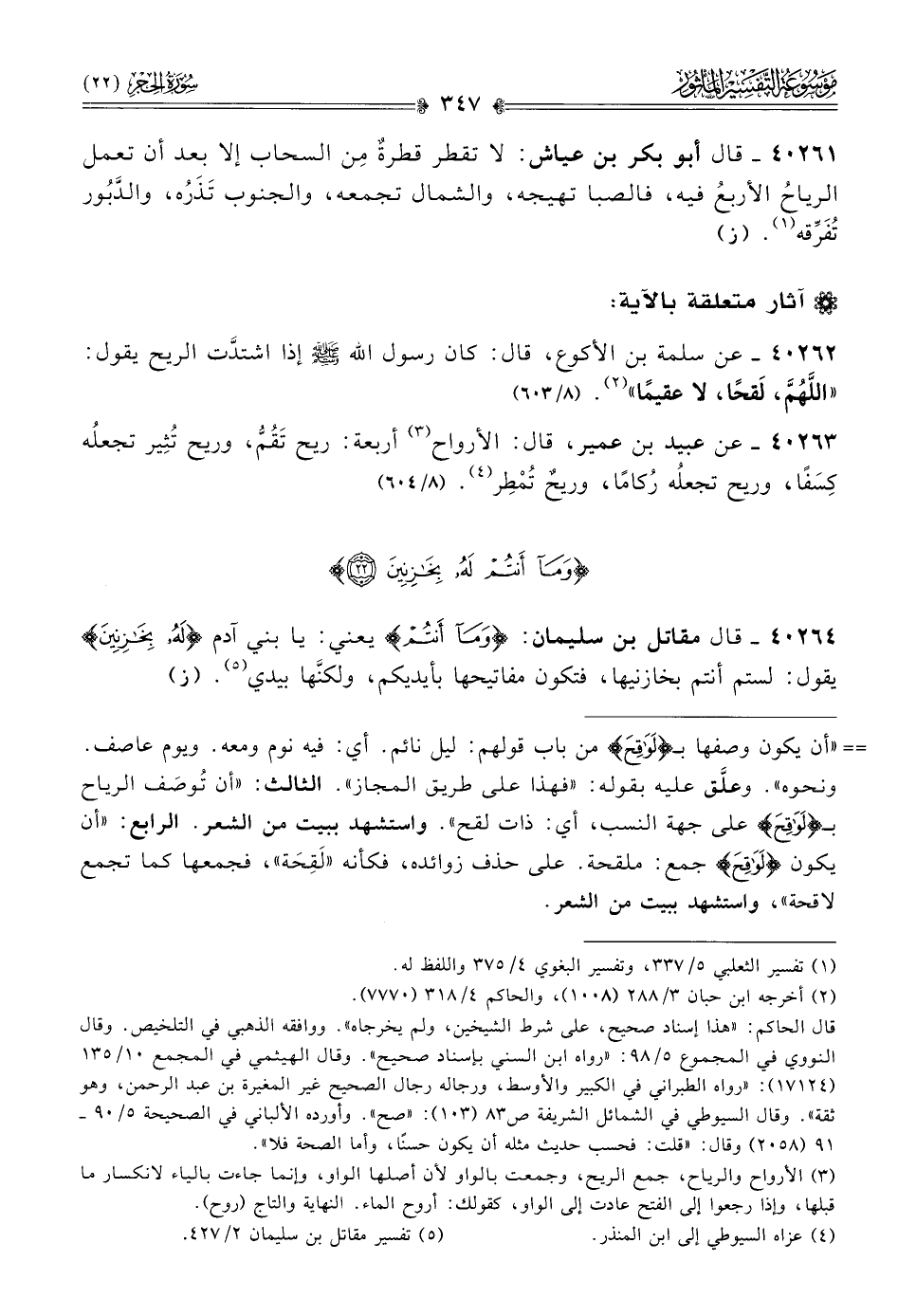 ٤٠٢٦٢ - عن سلمة بن الأكوع، قال: كان رسول الله - صلى الله عليه وسلم - إذا اشتدَّت الريح يقول: «اللهم، لَقحًا، لا عقيمًا» (¬٢). (٨/ ٦٠٣)