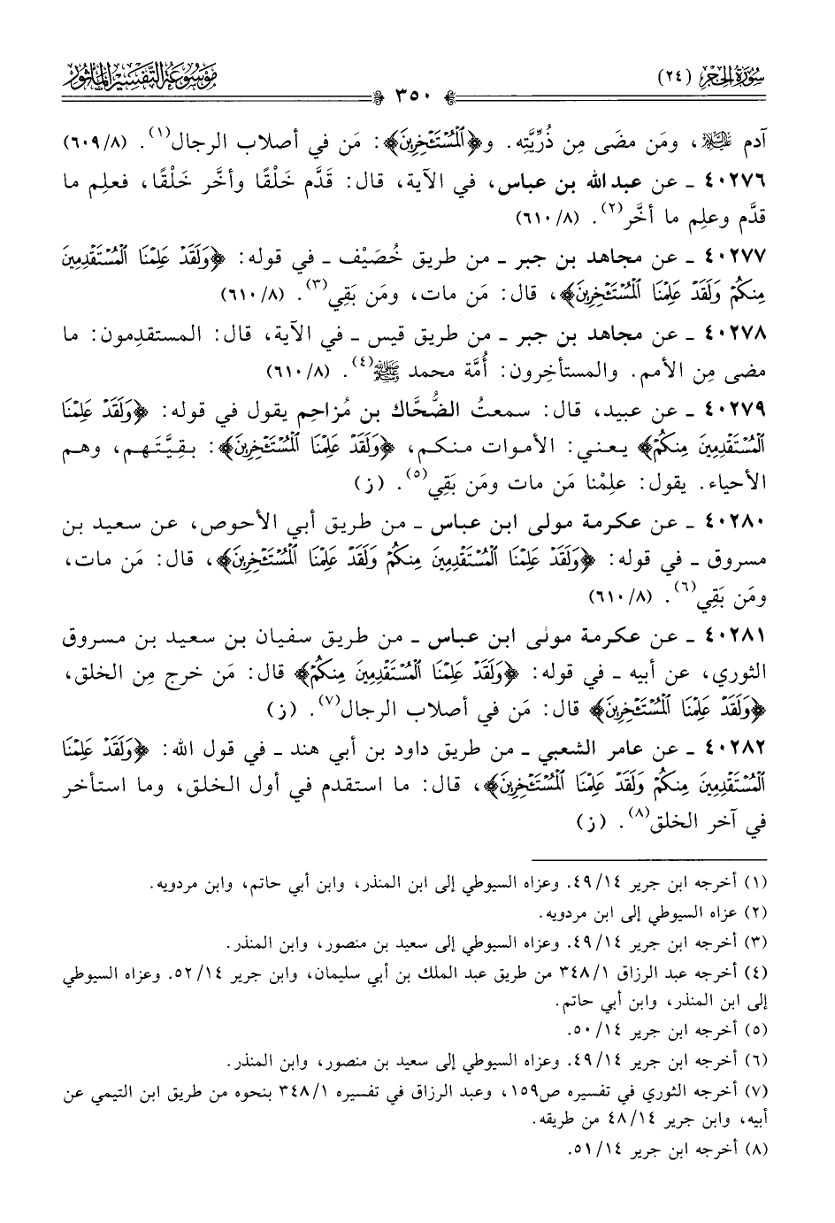 ٤٠٢٨٠ - عن عكرمة مولى ابن عباس -من طريق أبي الأحوص، عن سعيد بن مسروق- في قوله: {ولقد علمنا المستقدمين منكم ولقد علمنا المستأخرين}، قال: مَن مات، ومَن بَقِي (¬٦). (٨/ ٦١٠)