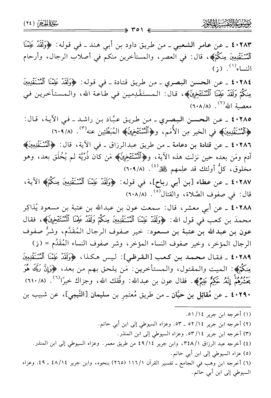 ٤٠٢٨٥ - عن الحسن البصري -من طريق عبّاد بن راشد- في الآية، قال: {المستقدمين} في الخير مِن الأُمَم، و {المستئخرين} المُبَطِّئِين عنه (¬٣). (٨/ ٦٠٩)