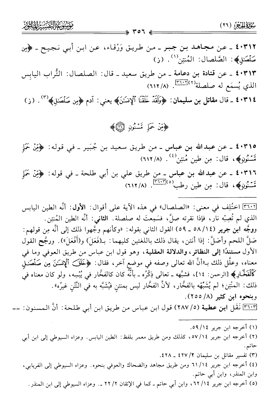 ٤٠٣١٦ - عن عبد الله بن عباس -من طريق علي بن أبي طلحة- في قوله: {من حمإ مسنون}، قال: مِن طين رطب (¬٥) [٣٦٠٣]. (٨/ ٦١٢)
